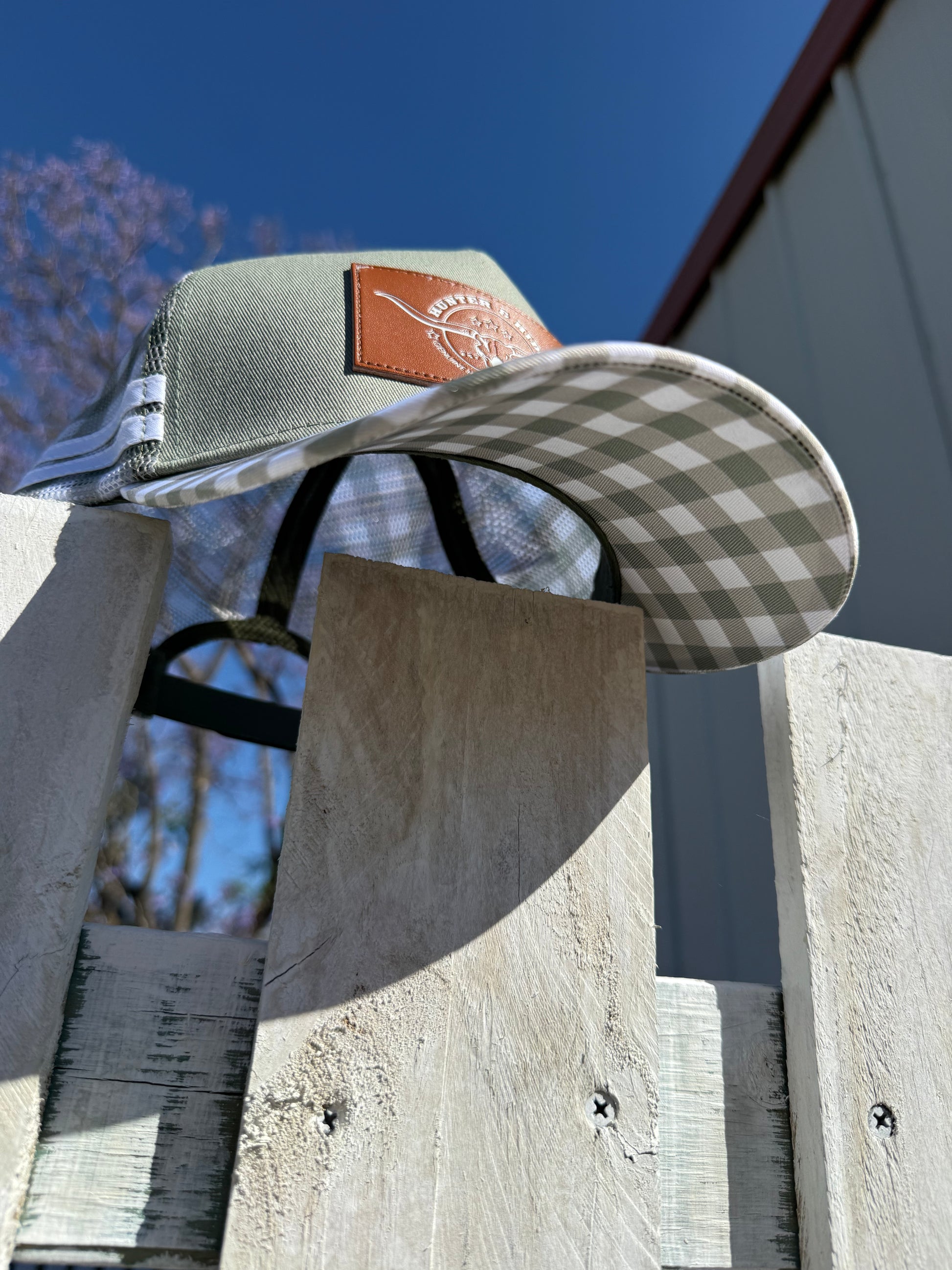 High profile and mid profile trucker caps; perfect for work or play! Featuring our leather logo and check pattern.